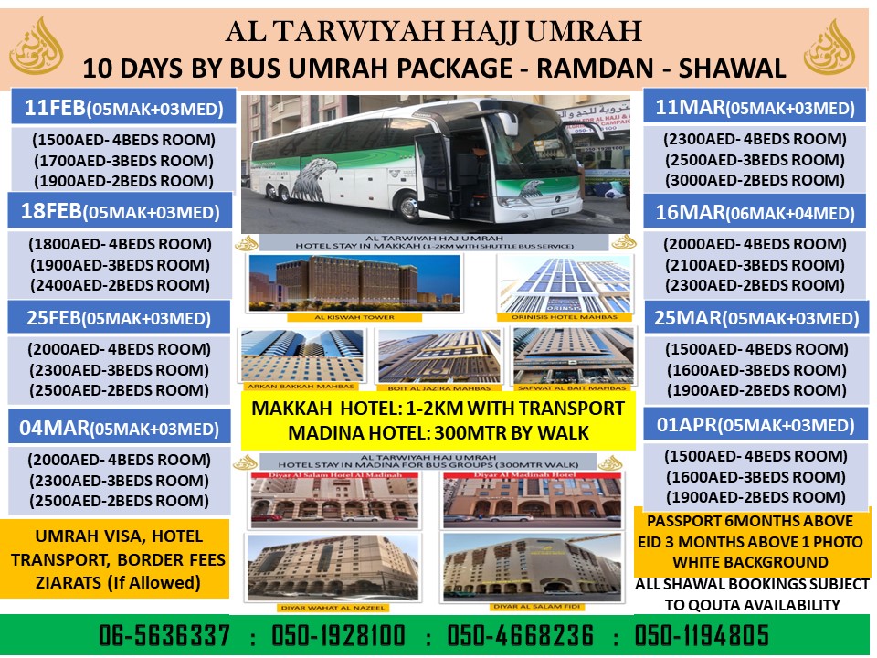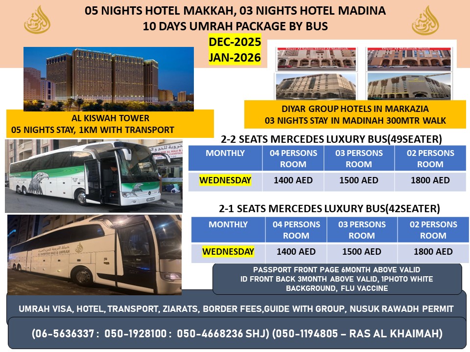 We provide Hajj and Umrah service through luxury buses and by Air from UAE. Every Wednesday Bus depart.